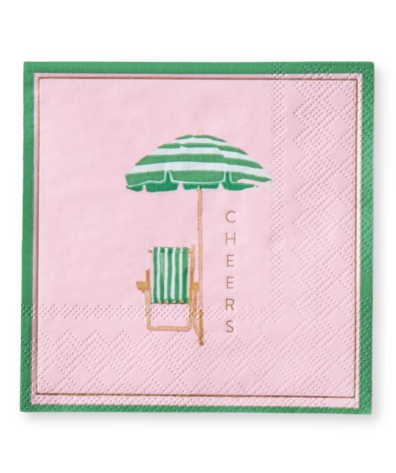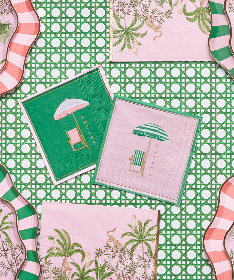 Bring a splash of tropical charm to your gatherings with our Palm Breeze Cabana Cocktail Napkins. Featuring a whimsical cabana umbrella and chair motif in playful shades of pink and vibrant green, these napkins capture the carefree spirit of seaside escapes. Perfect for poolside cocktails, summer soirées, or breezy brunches, they’re as stylish as they are functional.